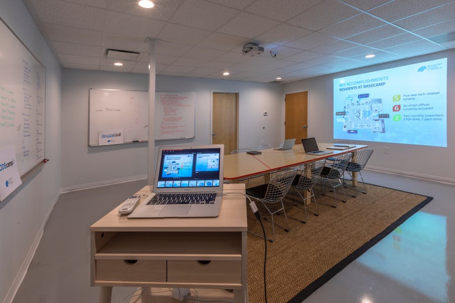 Membership Levels: Dedicated Desks & Resident level members receive unlimited access to conference room facilities at "BASEcamp." All other memberships are allotted a specific number of free conference room bookings prior to having the ability to book the conference room at a reduced rental rate.